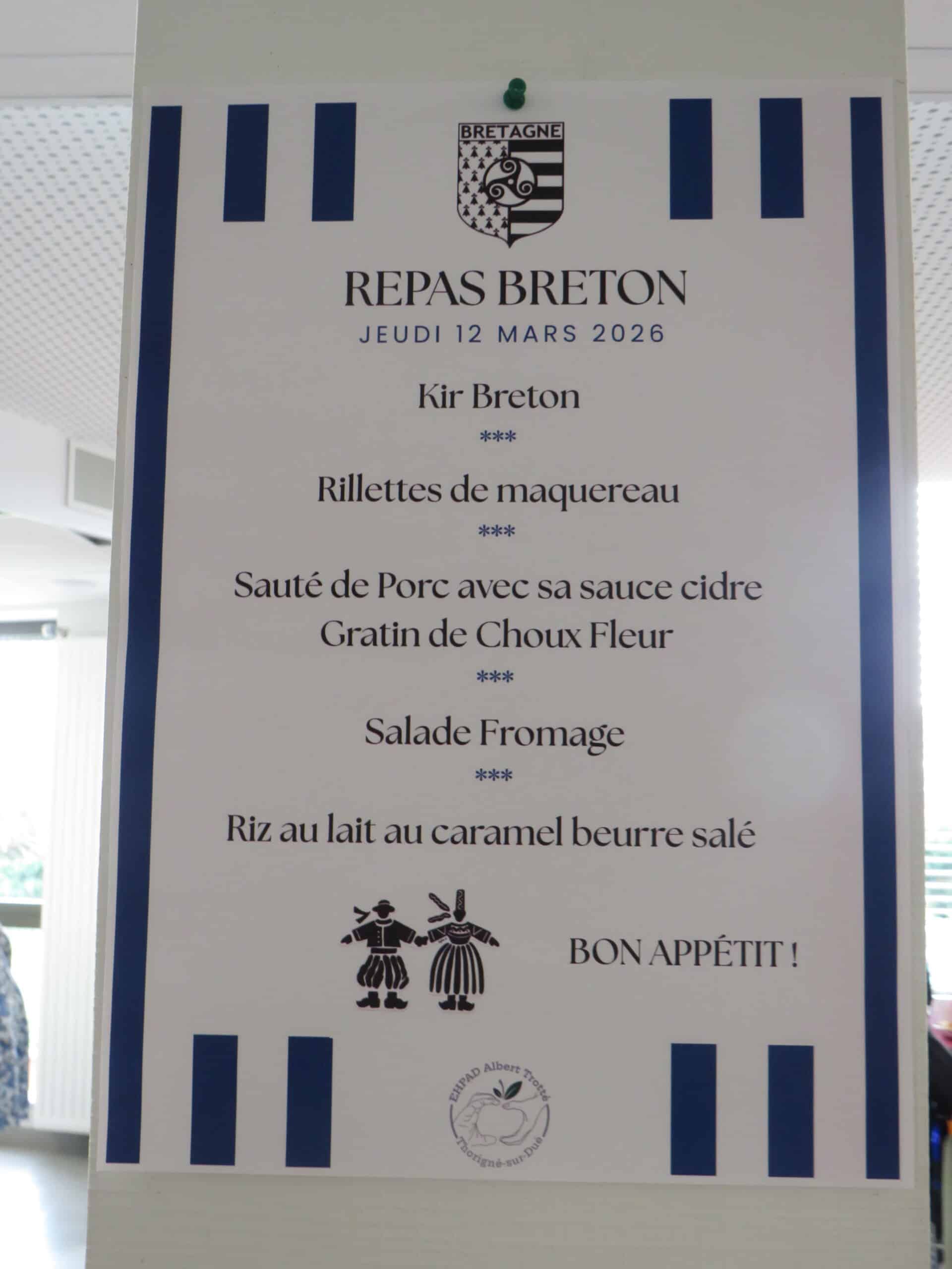 Au début du printemps, la Bretagne s’est invitée en Sarthe ! Pour cela, les résidents ont préparé une décoration bien adaptée : une grande banderole a été installée en salle à manger pour souhaiter la bienvenue en breton et en français. Des décorations de tables ont été réalisées lors d’ateliers créatifs célébrant notamment le drapeau breton. Le jeudi 12 mars, l’équipe cuisine a confectionné un délicieux repas, mettant à l’honneur les spécialités bretonnes qui ont régalé tous les convives !